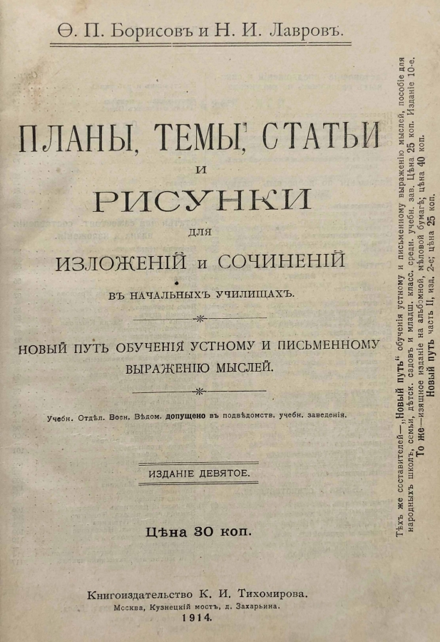 Полное название: Планы, темы, статьи и рисунки для изложений и сочинений в начальных училищах. Новый путь обучения устному и письменному выражению мыслей.