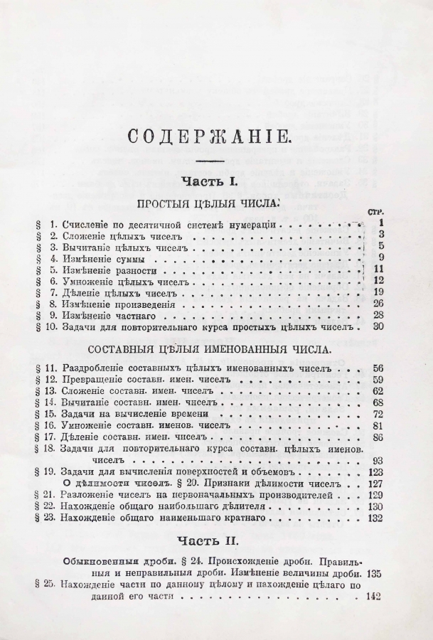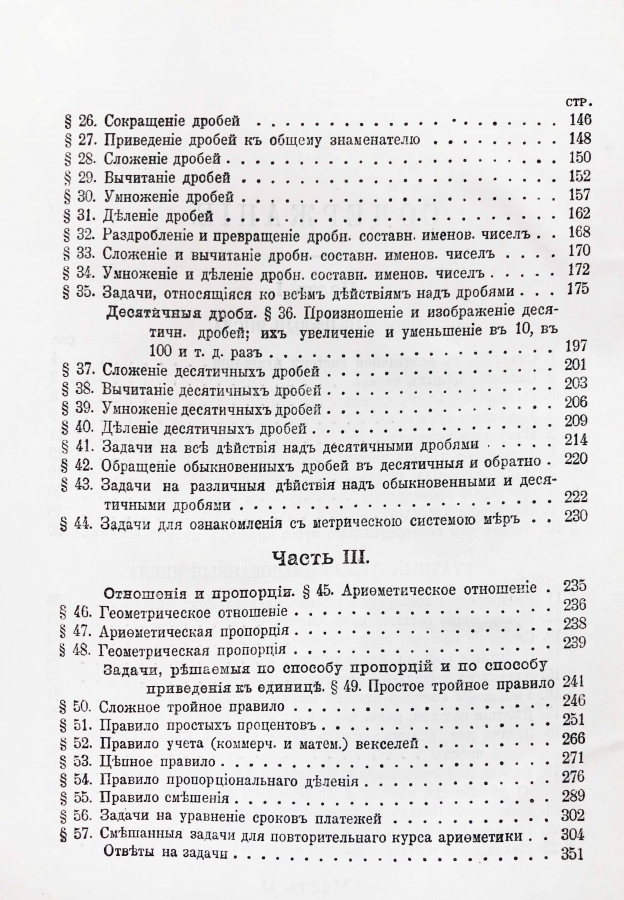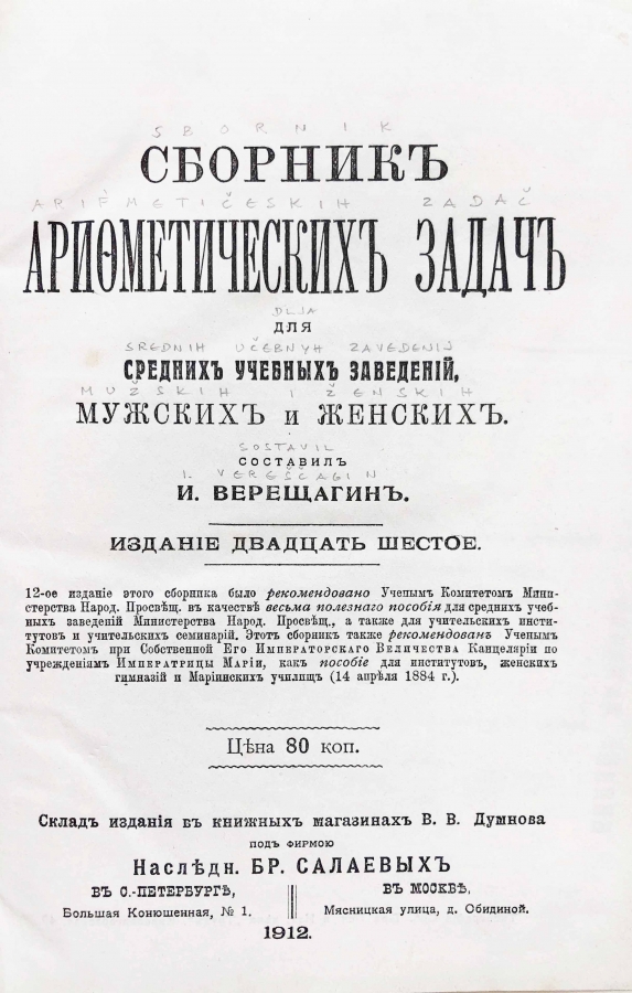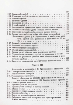 Сборник арифметических задач для средних учебных заведений, мужских и женских. Разделы в книге: Простые целые числа, Составные целые именованные числа, Обыкновенные дроби, Десятичные дроби, Арифметические отношения и пропорции.