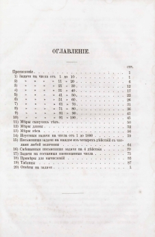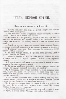 Сборник арифметических задач для приготовительного и систематического курса. В книге представлены задачи с числами от 1 до 100, изучены меры длинны и веса и дано множество письменных и устных задач на пройденные темы.