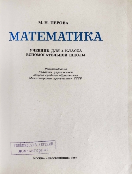 Учебник математики для четвертого класса вспомогательной школы советской эпохи. Рекомендован к изданию Главным управлением школ Министерства просвещения СССР.