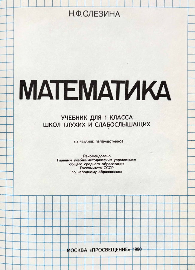 Учебник математики для первого класса школы глухих и слабослышащих советской эпохи. Рекомендовано Главным учебно-методическим управлением общего среднего образования Госкомитета СССР по народному образованию.