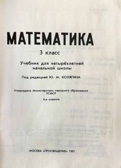 Учебник математики для третьего класса четырёхлетней начальной школы советской эпохи. Утверждено Министерством народного образования РСФСР. Под редакцией Ю. М. Колягина.