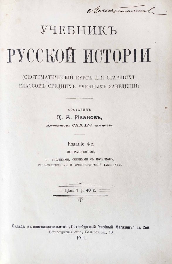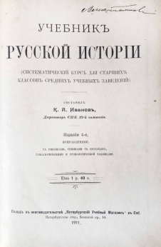 Систематический курс русской истории для старших классов средних учебных заведений. С рисунками, снимками с почерком, генеалогическими и хронологическими таблицами.