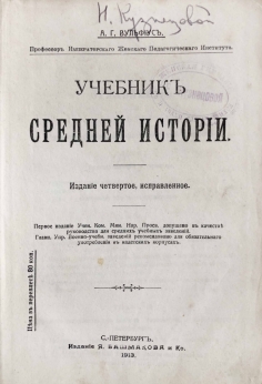 Александр Германович Вульфиус — российский и советский историк. Родился в семье прибалтийских немцев. А. Г. Вульфиус окончил Петришуле (Главное немецкое училище Св. Петра) в 1897 г. и поступил на историко-филологический факультет Санкт-Петербургского университета. После окончания Университета в течение 25 лет преподавал историю и географию в Петришуле. Будучи преподавателем, занимался и научной деятельностью, в основном изучая историю церкви и общественной мысли в Европе. Опубликовал несколько монографий по истории Западной Европы, учебники по средневековой и новой истории, неоднократно переиздававшиеся.