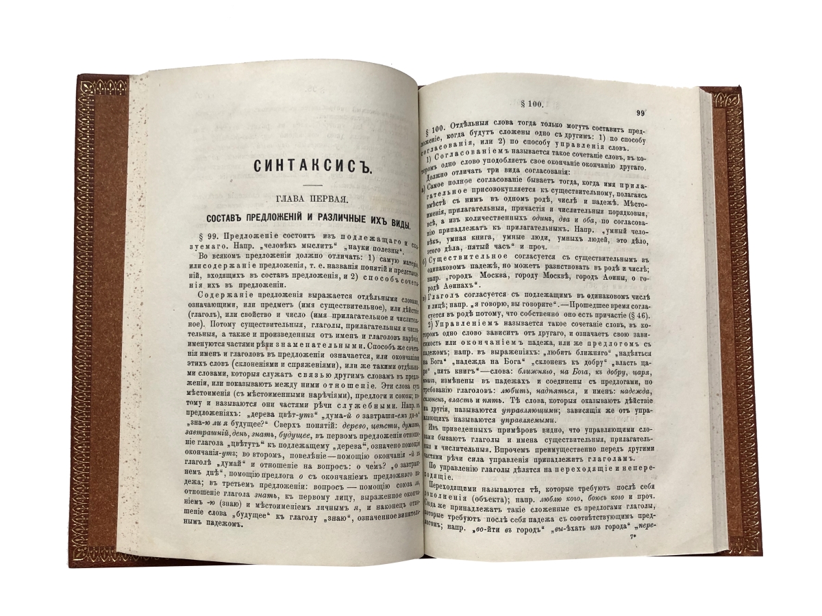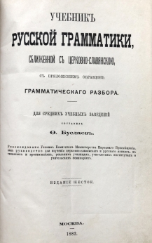 Учебник русской грамматики, сближенной с церковнославянской. С приложением образцов грамматического разбора. Вниманию читателей предлагается один из наиболее популярных в России гимназических учебников, созданный выдающимся русским филологом и педагогом Ф.И. Буслаевым (1818-1897). Учебник состоит из двух частей: в первой рассмотрены звуки, буквы, образование и особенности изменения частей речи, сложные слова, во второй — виды и состав предложений, характер синтаксического употребления частей речи, простое и сложное предложение. В приложении рассматривается порядок слов и даются образцы грамматического разбора. В дореволюционной России книга была рекомендована ученым комитетом министерства народного просвещения как руководство для изучения церковнославянского и русского языков в гимназиях и прогимназиях, реальных училищах, учительских институтах и семинариях. В наше время книга Ф.И. Буслаева является ценным источником, позволяющим ознакомиться как с методикой преподавания, так и с церковнославянскими корнями современного русского языка. Рекомендуется филологам-славистам, специалистам по истории русского и славянских языков, педагогам, студентам и всем, кто интересуется историей и проблемами преподавания русского языка. Книга представляет историческую и культурную ценность!