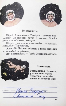 Букварь для тюркоязычных школ с русским языком обучения. На каждой странице букваря — иллюстрация, отражающая дух эпохи. Как и большинство букварей все начинается с простых букв с картинками, которые постепенно переходят в слоги, слова, предложения и несложные тексты.