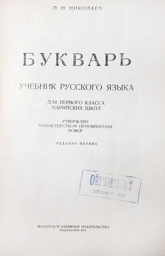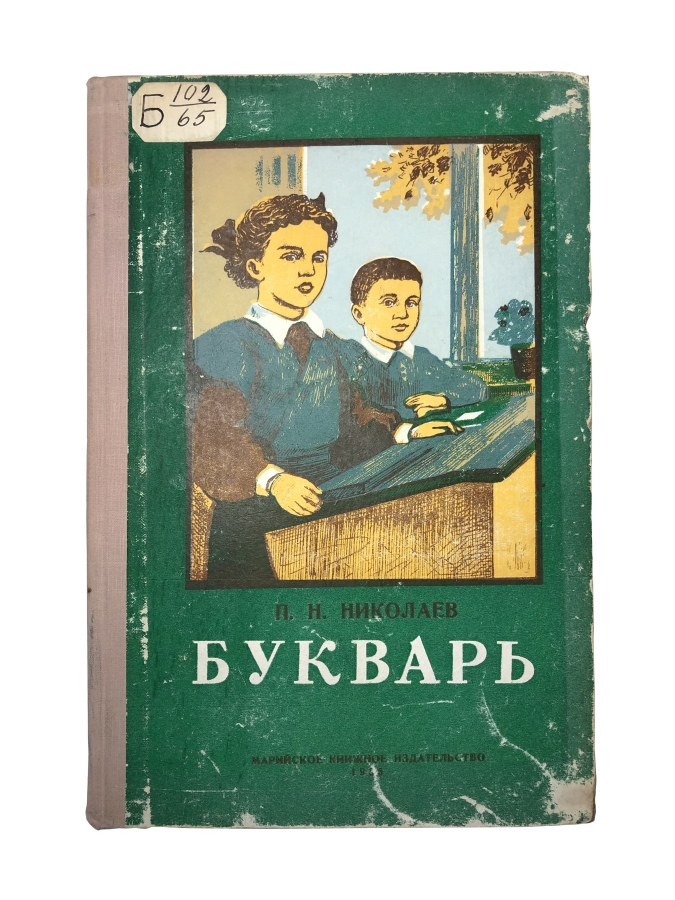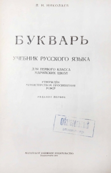 Учебник русского языка для первого класса марийских школ. Утвержден министерством просвещения РСФСР. В букваре множество иллюстраций и задания по каллиграфии.