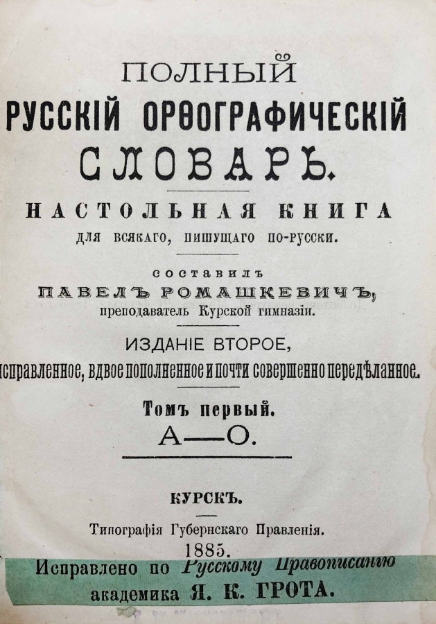 Полный русский орфографический словарь — настольная книга для всякого, пишущего по-русски. Составителем является Павел Ромашкевич, преподаватель Курской гимназии.