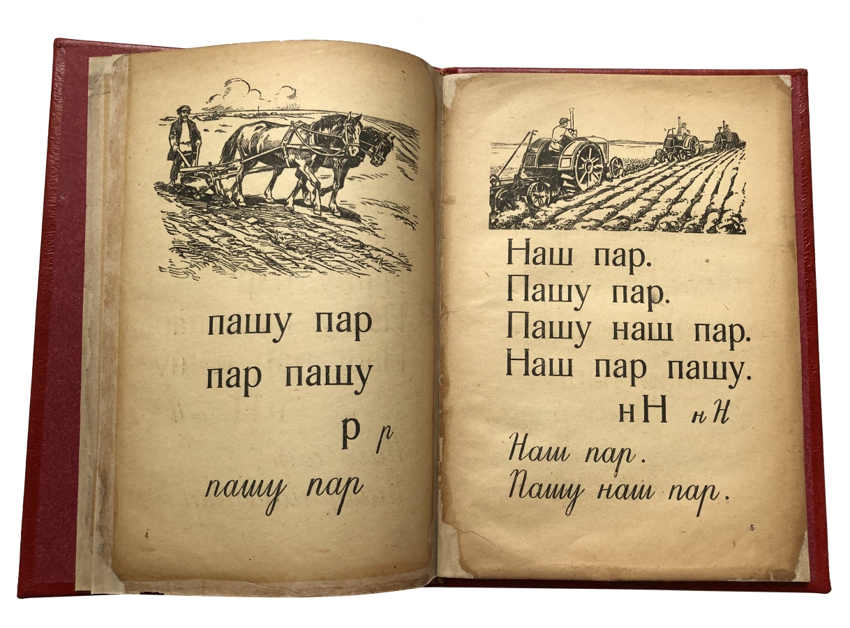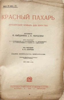 Деревенский букварь для взрослых «Красный пахарь». Допущено научно-политической секцией ГУСа. Всероссийская чрезвычайная комиссия по ликвидации неграмотности при Главполитпросвете. Сост. О. Кайданова, М. Поршнева. Под редакцией А. Е. Кайданова. Учебник, памятник эпохи, прекрасный образчик советской пропаганды. Книга на своем примере дает понять как на заре советской власти боролись с безграмотностью среди взрослого населения. Как была образована и получила развитие системы народного образования, бесплатного образования. Книга представляет историческую и культурную ценность!
