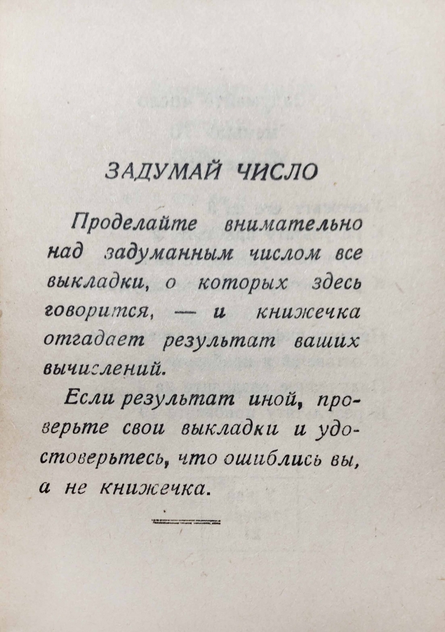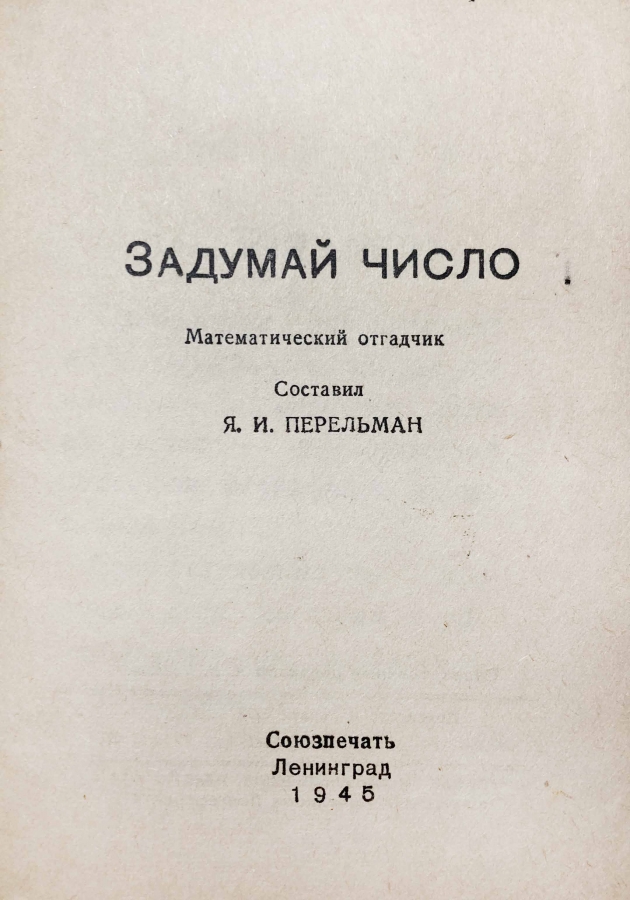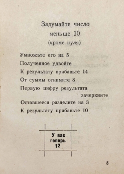Книга знаменитого писателя и популяризатора науки Якова Исидоровича Перельмана. Загадайте число, проделайте с ним описанные в книге действия, — и книжечка отгадает результат ваших вычислений.