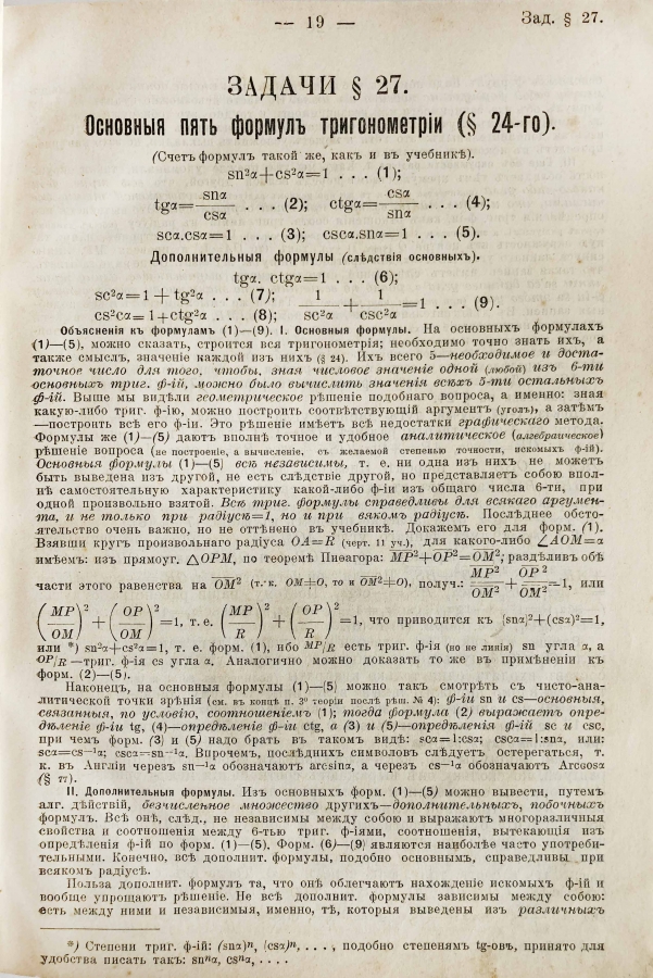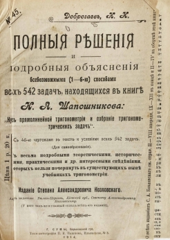 Полное название: Полные решения и подробные объяснения всевозможными (1-6-ю) способами всех 542 задач, находящихся в книге Н. А. Шапошникова "Курс прямолинейной тригонометрии и собрание тригонометрических задач". С 46 чертежами в тексте и условиями всех 542 задач. С весьма подробными теоретическими, историческими, практическими и другими интересными сведениями, которых нельзя почерпнуть в существующих ныне учебниках тригонометрии.