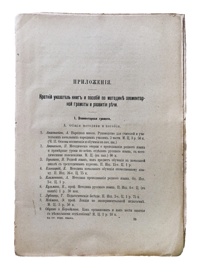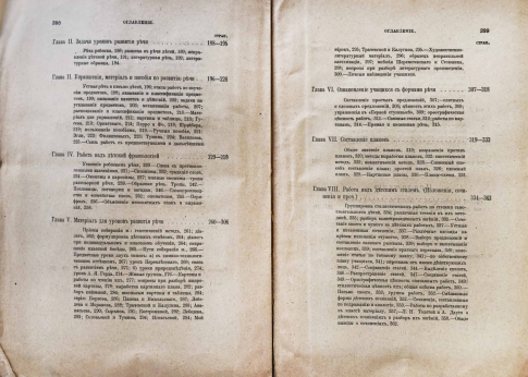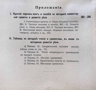 В приложение дан краткий указатель книг и пособий по методике элементарной грамоты и развития речи. И также таблицы по методике чтения и грамматики, в связи с методикою развития речи.