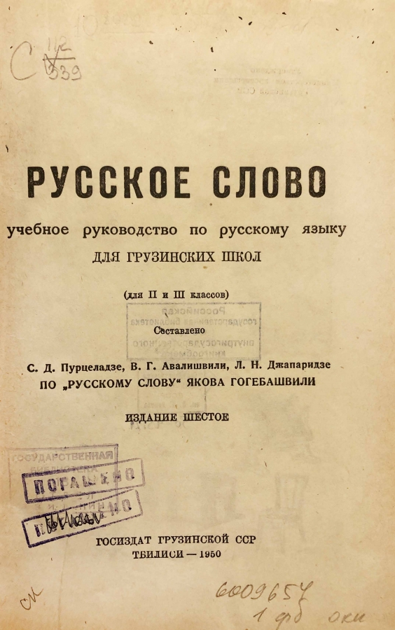 Учебное руководство по русскому языку для 2-го и 3-го класса грузинских школ. Учебник составлен по "Русскому слову" Я. Гогебашвили.