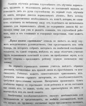 Разница в обучении глухонемого и обычного ребенка в том, что в первом случае трудней и дольше работать в постановке звуков. Поэтому глухонемые дети не могут с той же скоростью освоить книги, которые читают обычные дети. Вот почему появилась необходимость в издании, которое, не слишком отличаясь по внешнему виду от подобных же начальных книжек для детей, но по содержанию давало ребёнку возможность легче освоить чтение. Книга представляет собой букварь, в котором собран материал для облегчения работы учителя в подыскивании нужных сочетаний слов на пройденные звуки. И также предлагает ребенку тексты, которые он сможет прочитать. Книга представляет историческую и культурную ценность!