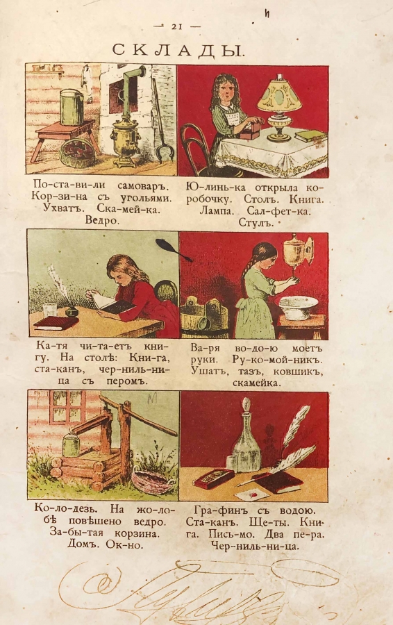 Настоящий букварь построен по звуковому методу. На каждой странице букваря — черно-белые и цветные иллюстрации, отражающие дух эпохи. Так же есть прописи и задания для изучения новых тем.