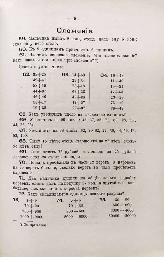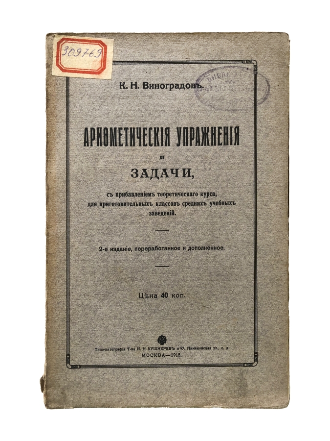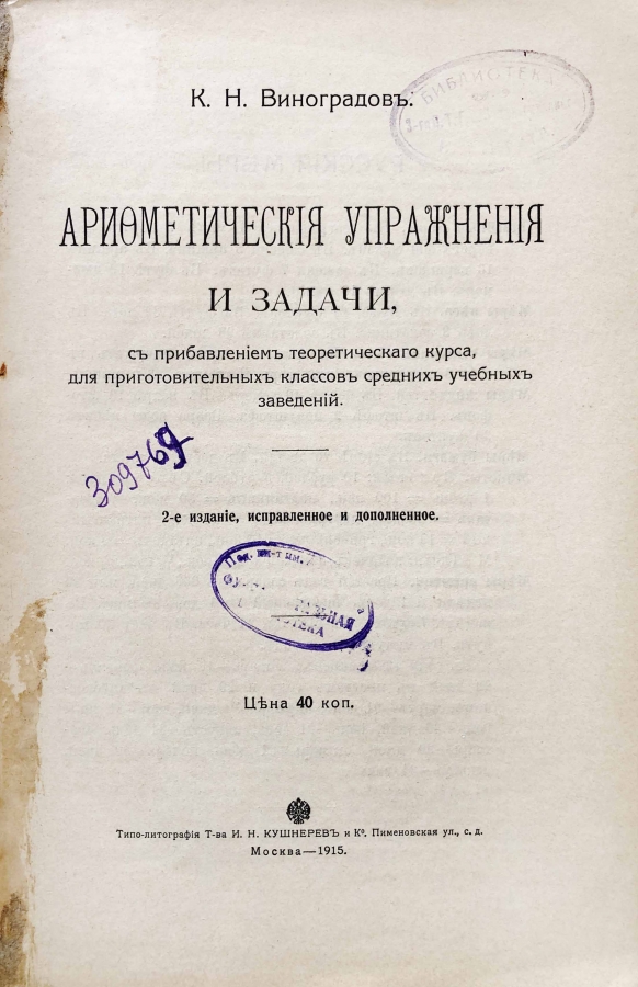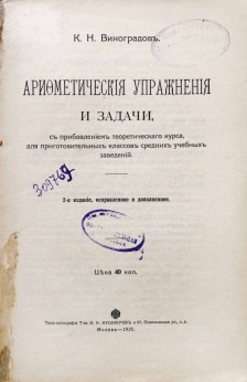 Арифметические упражнения и задачи, с прибавлением теоретического курса, для приготовительных классов средних учебных заведений. В учебнике множество задач, от легких к сложным.
