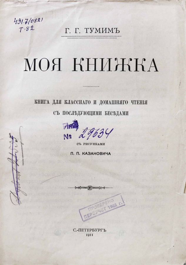 Владельческий полукожаный переплет. Есть потертости на переплете. Титул оторван от блока. Оригинал обложки сохранен в переплете. Печати несуществующих библиотек. Худ. П. П. Казанович.