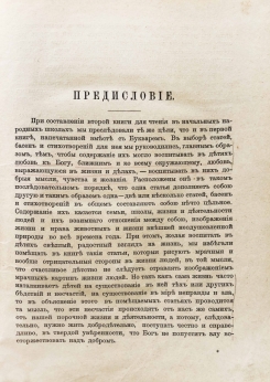 Из предисловия: При составлении второй книги для чтения мы преследовали то же цели, что и в первой книге. В выборе статей, басен и стихотворений для нее мы руководились, главным образом, тем, чтобы содержание их могло воспитывать в детях любовь к Богу, ближним и ко всему окружающему, любовь, выражающуюся в жизни и делах, — воспитывать в них добрые мысли, чувства и желания.