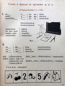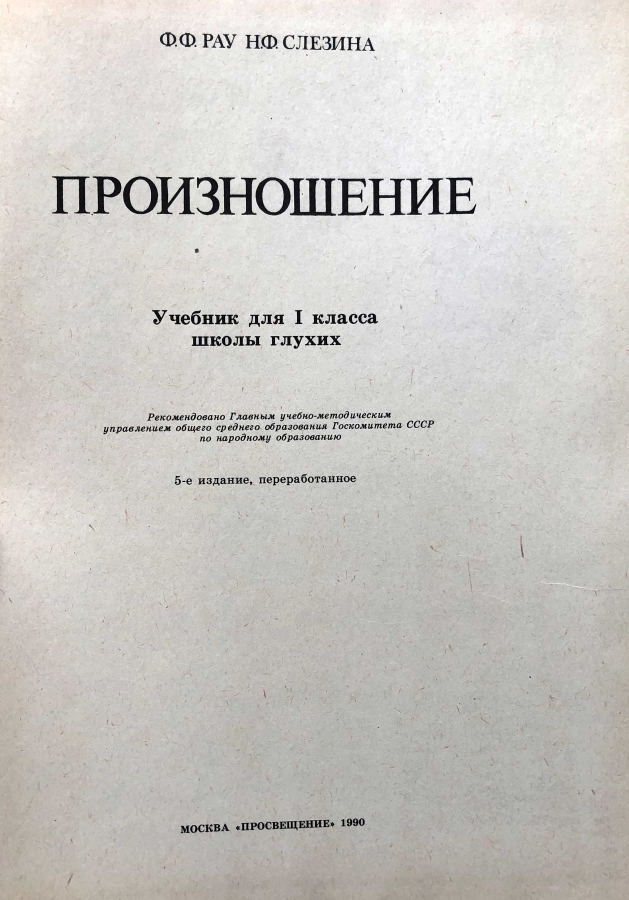 Учебник для 1 класса школ глухих, обучение произношению. В данном учебнике представлены упражнения для работы над произносительной стороной речи, а так же указан конкретный речевой материал (звуки, слоги, слова, фразы, небольшие тексты, стихотворения). Материал структурирован таким образом, что возможна работа над словом, его ударением и звуко-буквенным составом, над фразой, слитностью произношения, орфоэпией, дифференциацией произношения звонких и глухих звуков, аффрикатов и фрикативных звуков. Кроме этого предлагается материал для проверки внятности произношения.