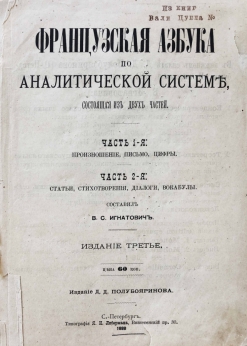 Учебник французского языка по аналитической системе, состоящий из 2-х частей. В первой части рассмотрены такие темы, как: Произношение, письмо, цифры. А во второй: Статьи, стихотворения, диалоги, вокабулы. Книга представляет историческую и культурную ценность!