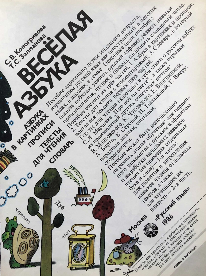 Пособие адресовано детям младшего возраста, изучающим русский язык как иностранный в детских садах, в школах, в семье. Основные цели пособия: помочь ребятам усвоить русский алфавит, развить навыки произношения, чтения и письма, расширить словарный запас. Пособие состоит из трёх частей: 1. Азбука в картинках и прописи; 2. Тексты для чтения с комментариями; 3. Словарь, в который вошла вся лексика первых двух частей. Тексты для чтения включают в себя стихи о русской азбуке С.Я. Маршака „Про всё на свете“, а также отрывки из произведений других советских поэтов: В. Маяковского, К. Чуковского, Е. Благининой, А. Барто, Е. Серовой, И. Токмаковой, Г. Виеру; народные загадки, считалки, скороговорки. Пособие может быть использовано на разных этапах обучения: для первичного знакомства с русским алфавитом и выработки начальных навыков чтения (на примерах отдельных букв и слов) — 1-я часть; для развития и закрепления навыков чтения отдельных текстов, а также для заучивания их наизусть — 2-я часть.