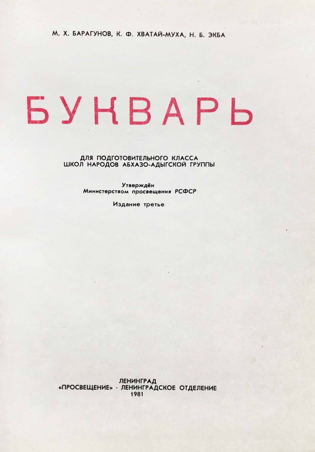 Букварь для школ народов абхазо-адыгской группы. Утверждён Министерством просвещения РСФСР. В книге содержатся различные упражнения для чтения и письма.