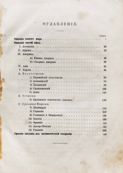 Разделы книги: Описание земного шара, Описание частей света (Австралия, Африка, Америка), Азия, Европа, Полуострова, Острова, Средняя Европа, Краткие сведения из математической географии.