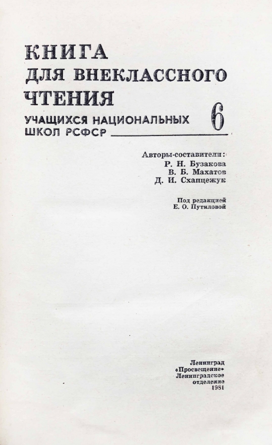 Пособие предназначено для учащихся национальных школ РСФСР. Составленная ведущими педагогами-практиками, она представляет собой собрание интересных и содержательных текстов, рекомендованных для самостоятельного чтения и обсуждения в классе. Черно-белые иллюстрации.