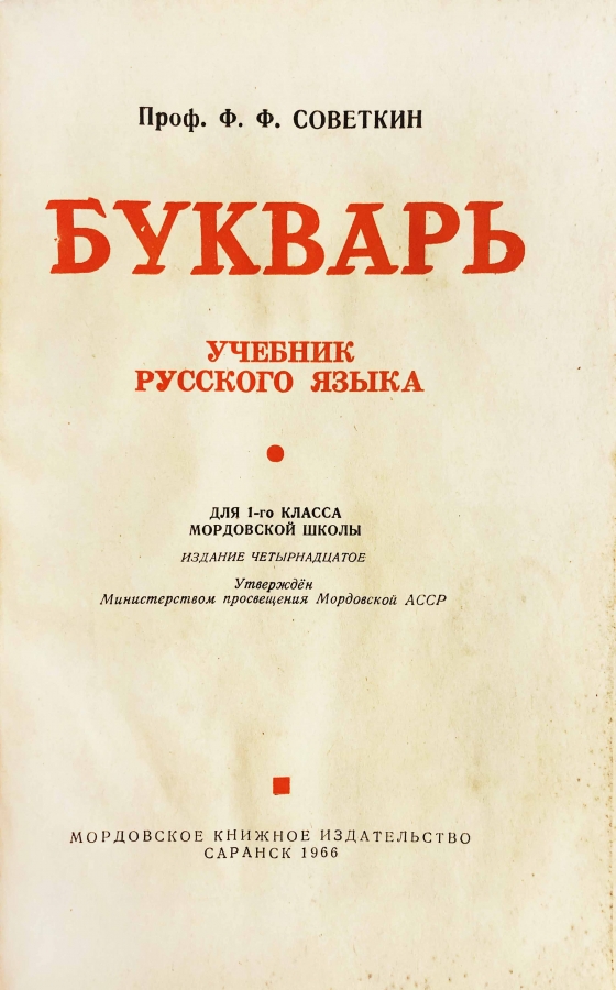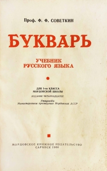 Учебное пособие для первого класса мордовской школы на русском языке. Книга, по которой первоклассники могли учиться читать и писать. Как и большинство букварей все начинается с простых букв с картинками, которые постепенно переходят в слоги, слова, предложения и несложные тексты.