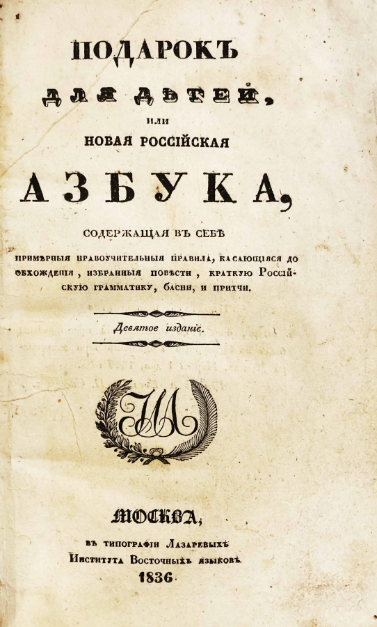 Полное название: Подарок для детей, или Новая российская азбука, содержащая в себе примерные нравоучительные правила, касающиеся до обхождения, избранные повести, краткую российскую грамматику, басни и притчи.