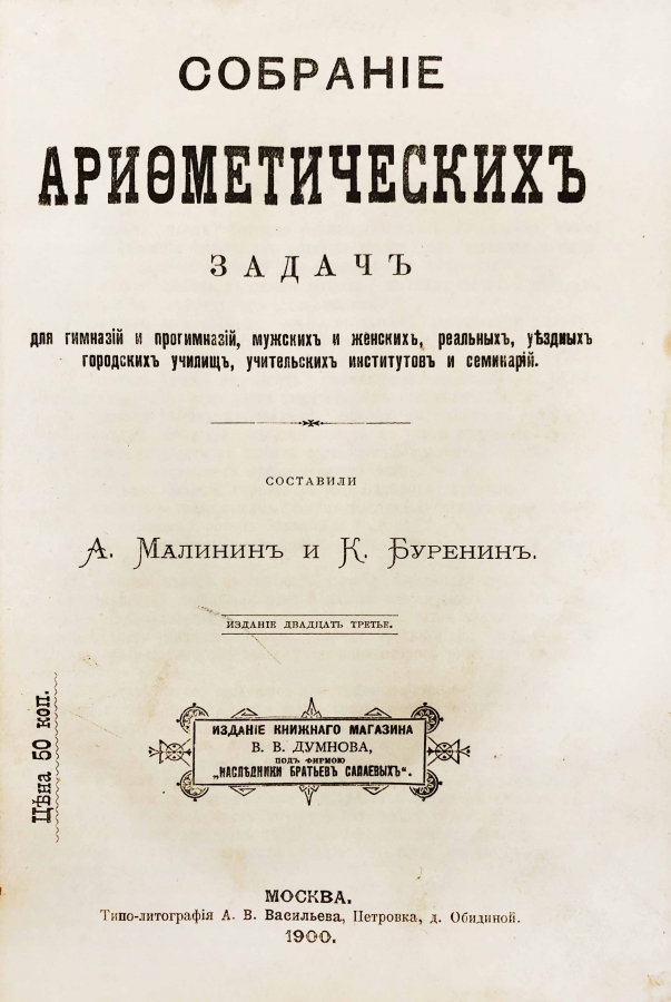 Собрание арифметических задач для гимназий и прогимназий, мужских и женских, реальных, уездных и городских училищ, учительских институтов и семинарий.