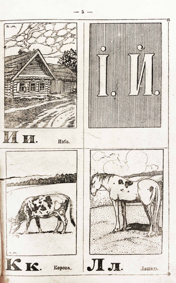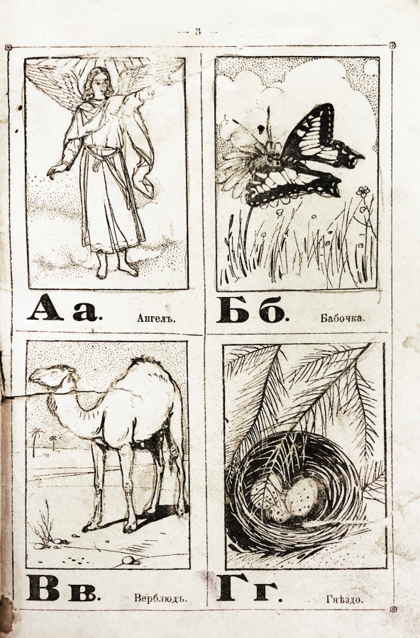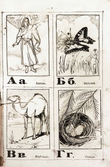 Издание с иллюстрированной азбукой и прописными буквами на обороте обложки. На каждой странице по четыре буквы с черно-белой иллюстрацией к каждой.