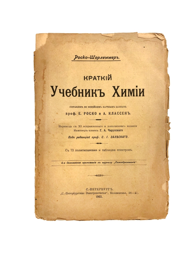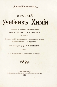 Составлен по новейшим научным данным профессоров Е. Роско и А. Классен. Перевод с XI исправленного и дополненного издания Инженер-химика Г. А. Чарусского. Под реакцией проф. С. И. Залеского. С 73 политипажами и таблицею спектров.