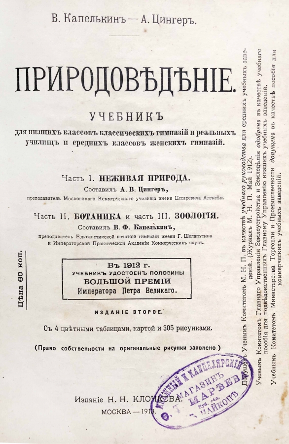 Учебник для низших классов классических гимназий, реальных училищ и средних классов женских гимназий. С 4 цветными таблицами, картой и 305 рисунками.