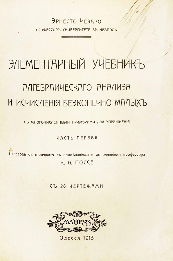 Эрнесто Чезаро — итальянский математик, специалист по математическому анализу и геометрии. Профессор Университета Палермо и Неаполитанского университета. Разработал метод суммирования рядом средними арифметическими, называемый методом Чезаро. Придумал «натуральную геометрию», позволяющую определять кривые и поверхности через инвариантные относительно замены координат величины.