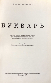 Первая книга по русскому языку для подготовительного класса ненецкой начальной школы. Книга, по которой первоклассники могли учиться читать и писать. Однако основная задача пособия состоит в том, чтобы начать формировать у детей любознательность, вызвать у ребенка стремление приобретать новые знания, развивать пытливый ум и усидчивость. Людмила Александровна Варковицкая — советский лингвист, фольклорист, педагог-методист. Специалист по самодийским языкам (ненецкому, эвенкийскому и селькупскому), опубликовала ряд трудов по грамматике этих языков на основе полевых лингвистических работ с носителями различных диалектов.