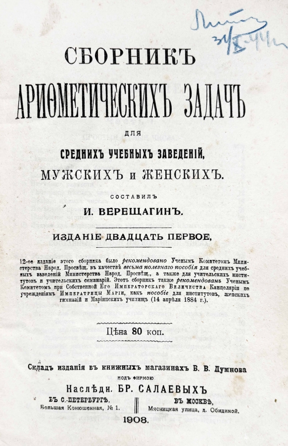 Книга "Сборник арифметических задач" для средних учебных заведений, мужских и женских