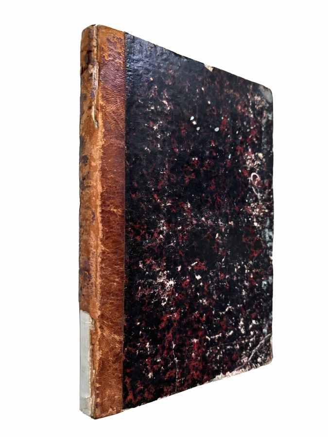 Полукожаный переплет эпохи. Потертости на переплете. Печати несуществующих библиотек на страницах. Лисьи пятна.