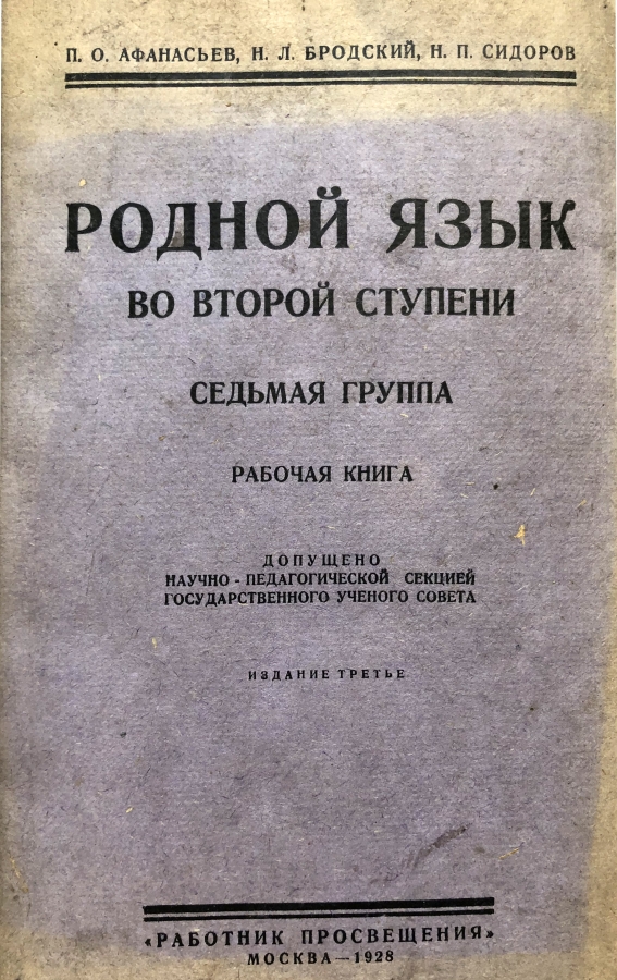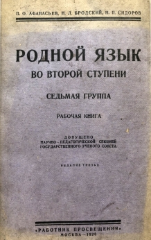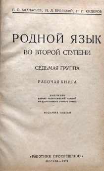 Родной язык во второй ступени. Седьмая группа. Из предисловия: Предлагаемая рабочая книга составлена применительно к новым программам ГУС‘а (1927 г.) по родному языку и литературе. Первый раздел книги, развертывающий картину литературно-общественного развития за сто лет, даёт разработку произведений писателей (классиков и современных), указанных в программе. Второй раздел книги даёт подбор художественных произведений, выражающих классовое самосознание поэта (произведения этого отдела частью подобраны по принципу параллелей — старых и современных поэтов — в их высказываниях). Книга завершается обобщающими статьями В. Белинского, Г. Плеханова и Н. Бухарина. Книга представляет историческую и культурную ценность!