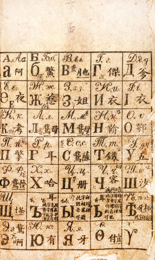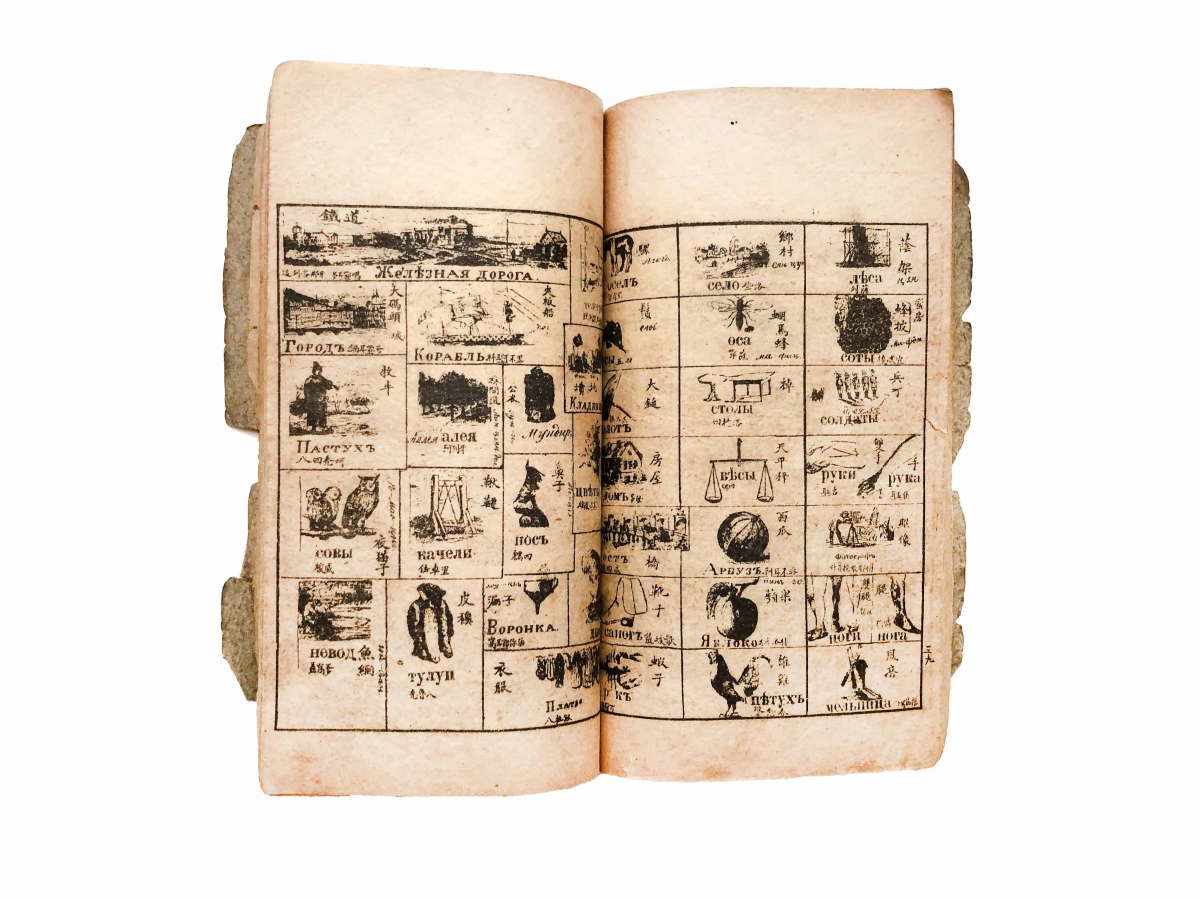 Азбука для изучения китайских иероглифов. Черно-белые картинки. Текст на китайском и русском. С помощью этого учебника можно было изучить основные значения иероглифов, алфавит, распространённые китайские фамилии, числа и предметы.