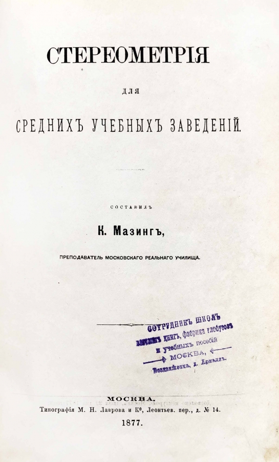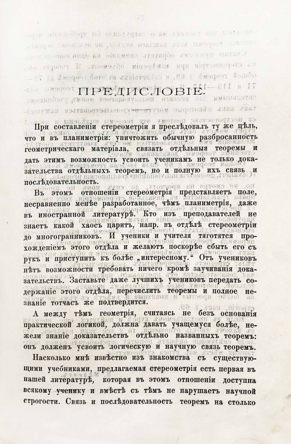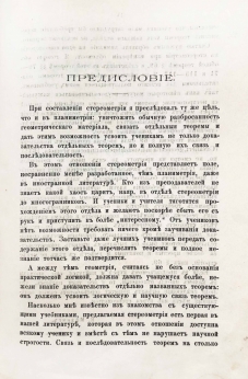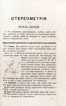 Из предисловия: При составлении стереометрии я преследовал ту же цель, что и в планиметрии: уничтожить обычную разбросанность биометрического материала, связать отдельные теоремы и дать этим возможность усвоить ученикам не только доказательства отдельных теорем, но и полную их связь и последовательность.