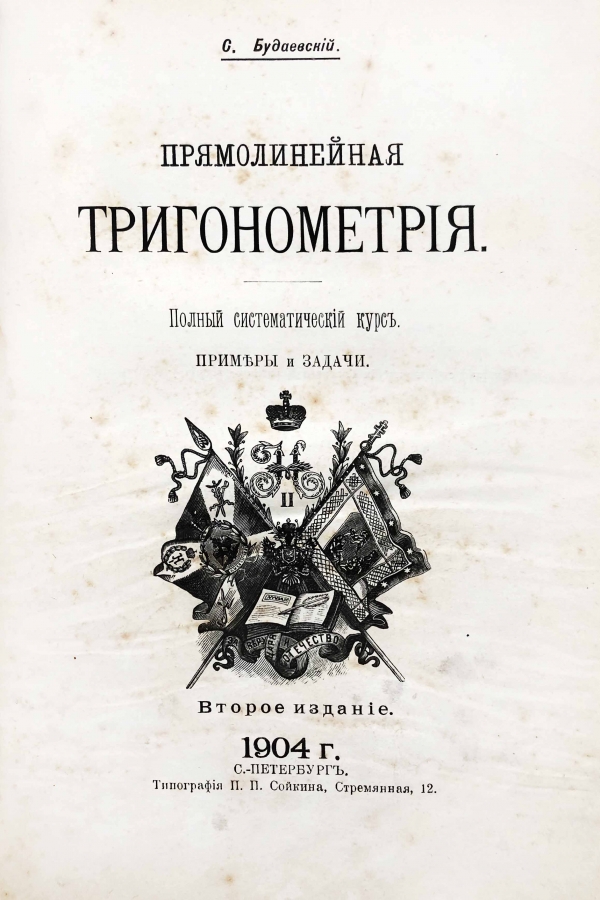 С. Будаевский. Прямолинейная тригонометрия. Спб.: тип. П.П. Сойкина. 1904 год. Изд. 2-е. 22,5 см.