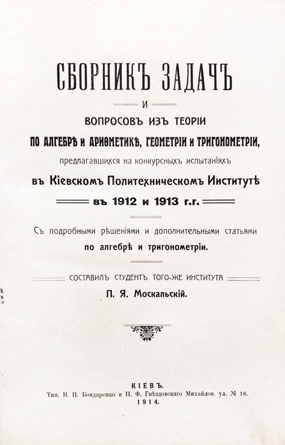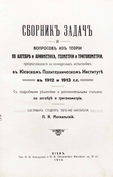 Сборник задач и вопросов из теории по алгебре и арифметике, геометрии и тригонометрии, предлагавшихся на конкурсных испытаниях в Киевском политехническом институте в 1912 и 1913 гг. С подробными решениями и дополнительными статьями по алгебре и тригонометрии.