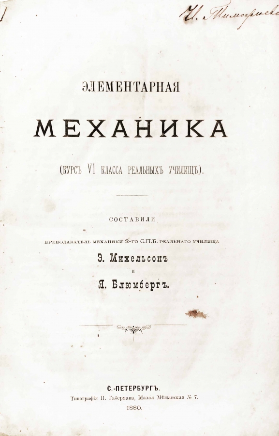 Курс механики для 6 класса составили преподаватели механики 2-го Спб. Реального училища Э. Михельсон и Я. Блюмберг.
