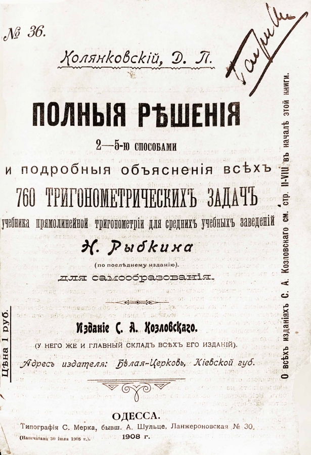Полное название: Полные решения 2-5-ю способами и подробные объяснения всех 760 тригонометрических задач учебника прямолинейной тригонометрии для средних учебных заведений Н. Рыбкина.