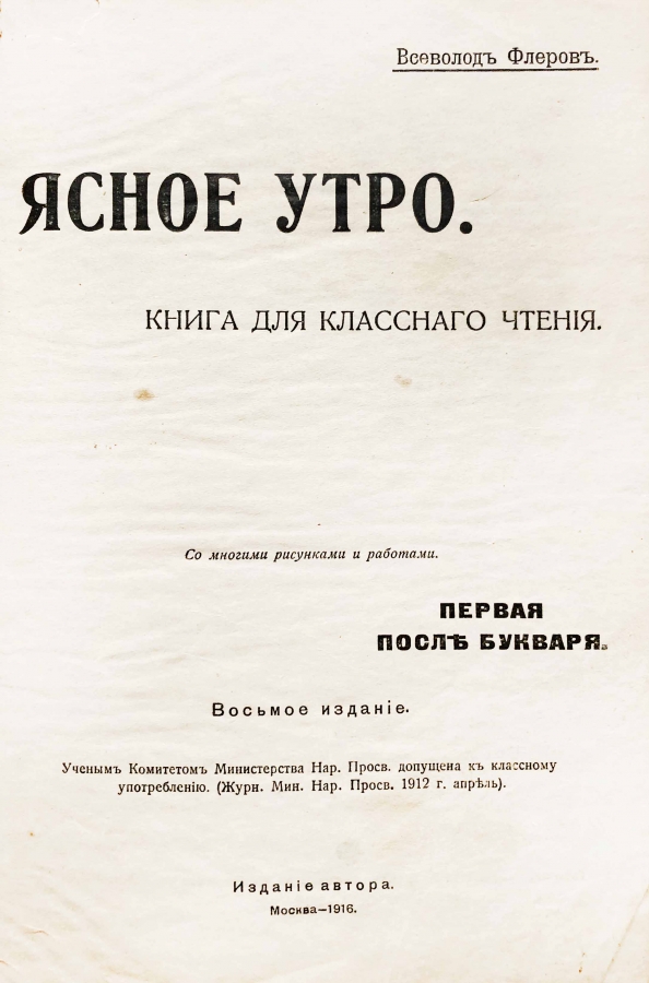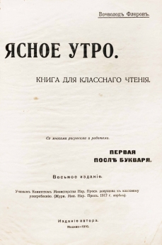 Всеволод Александрович Флеров — русский педагог и литератор, деятель народного образования. В профессиональной среде известен как автор выдержавшего 41 издание «Нового русского букваря» (1906). "Ясное утро" — это первая после букваря книга для классного чтения. Книга содержит рисунки, прописи и тексты для чтения.