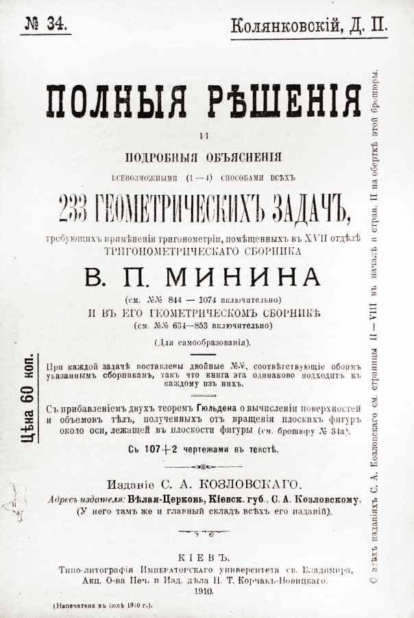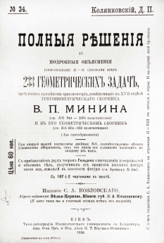 Полное название: Полные решения и подробные объяснения всевозможными (1-4) способами всех 233 геометрических задач, требующих применения тригонометрии, помещенных в XVII отделе Тригонометрического сборника В.П. Минина (см. № 844-1074 включительно) и в его геометрическом сборнике (см. № 634-853 включительно). Для самообразования. С прибавлением двух теорем Гюльдена.