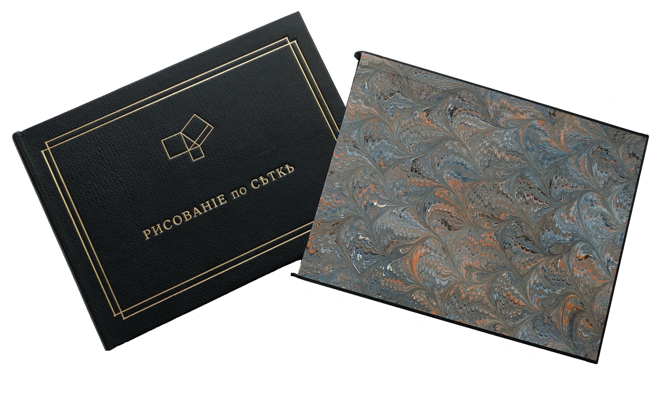 Владельческий переплёт, на крышку переплета наклеен фрагмент оригинальной обложки. Цельнокожанная папка для книги с золотым тиснением. Футляр.