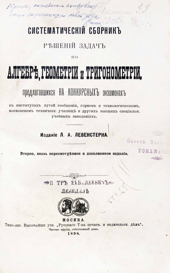 Полное название: Систематический сборник решений задач по алгебре, геометрии и тригонометрии, предлагавшихся на конкурсных экзаменах в институтах путей сообщения, Горном и Технологическом, Московском техническом училище и других высших специальных учебных заведениях.