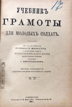 Книга предназначена для обучения солдат чтению и письму на русском и церковнославянском языках, а так же счёту. В конце книги помещён отдел «На досуге» — загадки и задачки с решениями. Для обучения чтению подобраны рассказы, стихотворения и басни И. Крылова, А. Измайлова, М. Загоскина, М. Лермонтова и др. Сергей Иринеевич Миропольский (1842-1907) — педагог, один из идеологов церковно-приходной школы XIX века. Считал образование делом государственной важности. В 1870-х-1880-х стало меняться отношение к церковно-приходским школам и к образованию в целом, и С.И. Миропольский был активным участником происходящих изменений в системе образования. Автор многих учебных пособий и статей о методике преподавания. Книга представляет историческую и культурную ценность!